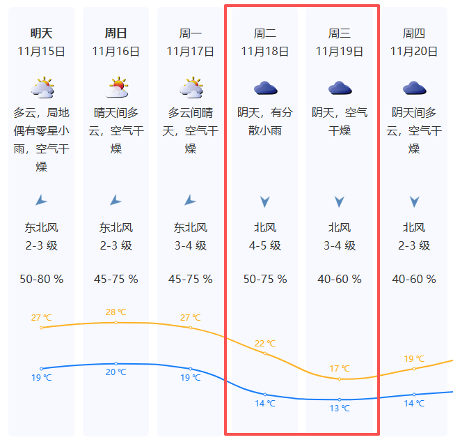 18-20日阴天到多云,其中18日有分散小雨,早晚体感冷。