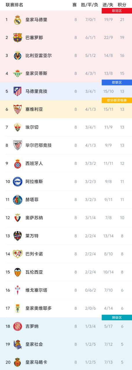 虎扑10月06日讯西甲第8轮最后一场比赛,塞尔塔1-1战平马竞。本轮西甲10场比赛全部结束,积分榜的形势随之出现了新的变化。